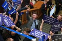Members of the conservative liberal Venstre party react after the General Election in the Danish Parliament in Copenhagen, Denmark, Tuesday, March 24, 2026. (AP Photo/Sergei Grits)