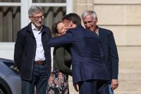 Jacques Paris, left, and Cecile Kohler, French nationals who were freed by Iran with after three and a half years in detention, walk at the Elysee Palace as they are hosted by French President Emmanuel Macron, in Paris, France, April 8, 2026. (Tom Nicholson/Pool Photo via AP)