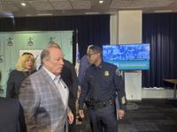 Detroit Mayor Mike Duggan and interim police Chief Todd Bettison leave a news conference on Feb. 11, 2025, in Detroit, after speaking about the deaths of two children in a cold vehicle. (AP Photo/Ed White)