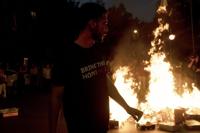 A supporter of Israeli-American hostage Hersh Goldberg-Polin, who was kidnapped on Oct. 7, 2023, walks near a bonfire lit in protest outside of Israeli Prime Minister Benjamin Netanyahu's residence to demand a deal for the immediate release of all hostages, after Hamas released a video of Goldberg-Polin, in Jerusalem, Wednesday, April 24, 2024. (AP Photo/Maya Alleruzzo)
