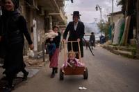 FILE - A child is transported on a dolly in the Orthodox neighborhood of Mea Shearim in Jerusalem during final preparations for the Passover holiday, April 11, 2025. (AP Photo/Ohad Zwigenberg, File)