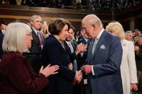 Sen. Amy Klobuchar, D-Minn., shakes hands with Britain's King Charles III before he addresses a joint meeting of Congress in the House Chamber at the U.S. Capitol, Tuesday, April 28, 2026, in Washington. (Kylie Cooper/Pool via AP)