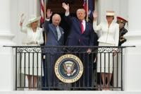 President Donald Trump, first lady Melania Trump, Britain's King Charles III and Queen Camilla wave from the Blue Room Balcony during a State Visit arrival ceremony on the South Lawn of the White House, Tuesday, April 28, 2026, in Washington. (AP Photo/Alex Brandon)