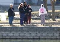 Bystanders watch from the edge of a pond as a body is removed at Shoreline Apartments Thursday, Oct. 27, 2022, in Tulsa, Okla. A naked suspect in a Tulsa apartment clubhouse burglary broke from their custody, jumped into a pond and drowned early Thursday, police said. (Mike Simons/Tulsa World via AP)