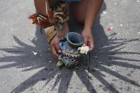 Mexica dancers burn incense marking the 700th anniversary of the founding of Tenochtitlan, known today as Mexico City, in the capital's main square, the Zocalo, Saturday, July 26, 2025. (AP Photo/Eduardo Verdugo)