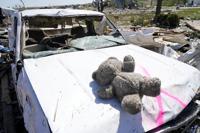 A teddy bear sits on the hood of a tornado damaged vehicle, Thursday, May 23, 2024, in Greenfield, Iowa. (AP Photo/Charlie Neibergall)