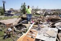 Mitch Ernst, of Adair, Iowa, sorts through debris from his mother-in-law's tornado damaged home, Thursday, May 23, 2024, in Greenfield, Iowa. (AP Photo/Charlie Neibergall)