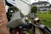 Guillermo Vargas surveys damage to his home, where his garage was swept off its foundation, while cleaning up storm damage after severe weather hit in the Memorial Northwest subdivision, in Spring, Texas, Monday, Nov. 24, 2025. (Brett Coomer/Houston Chronicle via AP)
