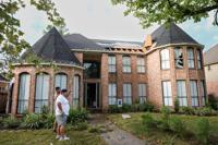Jose Rosas surveys damage to Guillermo Vargas' home as while helping clean up storm damage in the Memorial Northwest subdivision, in Spring, Texas, Monday, Nov. 24, 2025. (Brett Coomer/Houston Chronicle via AP)