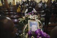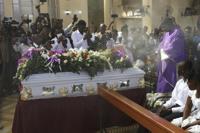 A priest blesses the coffin of journalist Jimmy Jean, who was killed during a gang attack on the General Hospital, during his church funeral in the Petion-Ville neighborhood of Port-au-Prince, Haiti, Thursday, Jan. 16, 2025. (AP Photo/Odelyn Joseph)