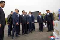 In this photo provided by the North Korean government, officials from North Korean and Russia stand in front of a monument to mark a ground-breaking ceremony for the construction of a bridge between the two countries, in Rason Municipality, North Kora Wednesday, April 30, 2025. Persons are not identified. Independent journalists were not given access to cover the event depicted in this image distributed by the North Korean government. The content of this image is as provided and cannot be independently verified. Korean language watermark on image as provided by source reads: "KCNA" which is the abbreviation for Korean Central News Agency. (Korean Central News Agency/Korea News Service via AP)