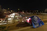 FILE -In this photo illuminated by an off-camera flash, a tarp covers a portion of a homeless person's tent on a bridge overlooking the 101 Freeway in Los Angeles, Thursday, Feb. 2, 2023. The number of homeless residents counted in Los Angeles County spiked again, increasing by 9% since last year in the latest marker of how deep the crisis is of people sleeping in cars, encampments or shelters in California. (AP Photo/Jae C. Hong, File)