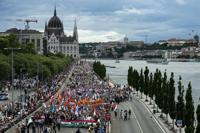 People march during a rally in support of Hungary's Prime Minister Viktor Orbán and his party in Budapest, Hungary on Saturday, June 1, 2024. Orbán, whose 14 years in power make him the European Union's longest serving leader, has focused his campaign for the June 9 European Parliament elections on the war in Ukraine, portraying his domestic and international opponents as warmongers who seek to involve Hungary directly in the conflict. (AP Photo/Denes Erdos)