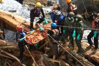 Rescuers use ropes to evacuate the body of a flood victim in Tanah Datar, West Sumatra, Indonesia, Monday, Dec. 1, 2025. (AP Photo/Nazar Chaniago)