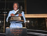 Colorado’s Travis Hunter reacts after winning the Heisman Trophy as the outstanding player in college football, Saturday, Dec. 14, 2024, in New York.(Todd Van Emst/Heisman Trust via AP, Pool)