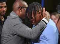Colorado’s Travis Hunter, right, and coach Deion Sanders embrace after Hunter won the Heisman Trophy as the outstanding player in college football, Saturday, Dec. 14, 2024, in New York.(Todd Van Emst/Heisman Trust via AP, Pool)
