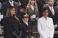 Melania Trump and Usha Vance watch as President-elect Donald Trump participates in a wreath laying ceremony at the Tomb of the Unknown Solider at Arlington National Cemetery, Sunday, Jan. 19, 2025, in Arlington, Va. (AP Photo/Evan Vucci)
