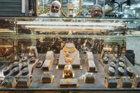 Goldsmith wait for customers at their gold jewelry shop in Lahore, Pakistan, Tuesday, April 8, 2025. (AP Photo/K.M. Chaudary)