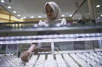 A vendor arranges gold jewelry in Jakarta, Indonesia, Thursday, April 10, 2025. (AP Photo/Achmad Ibrahim)