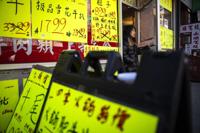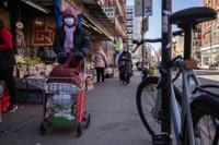 A person with a shopping bag and cart walks past a grocery store in the Chinatown neighborhood, Wednesday, April 9, 2025, in New York. (AP Photo/Yuki Iwamura)