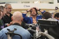 A trader reacts as other traders work on the options trading floor at the Cboe Global Markets in Chicago, Tuesday, April 8, 2025. (AP Photo/Nam Y. Huh)