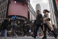 People walk past the Nasdaq MarketSite, Thursday, April 10, 2025, in New York. (AP Photo/Yuki Iwamura)