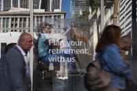 People walk past a retirement advertisement from Merrill Lynch in Los Angeles Tuesday, April 8, 2025. (AP Photo/Jae C. Hong)