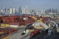 Shipping containers are seen near downtown Los Angeles, Tuesday, April 8, 2025. (AP Photo/Jae C. Hong)