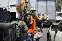 Filipino Andy Chavez peddles different kinds of goods to motorists during traffic along a busy street in Quezon city, Philippines, Thursday, April 10, 2025. (AP Photo/Aaron Favila)