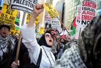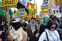 Protesters hold up signs as they march and attempt to block a street during the 80th session of the United Nations General Assembly, Tuesday, Sept. 23, 2025, in New York. (AP Photo/Heather Khalifa)