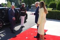 President Donald Trump and first lady Melania Trump greet Britain's King Charles III and Queen Camilla as they arrive at the White House, Monday, April 27, 2026, in Washington (AP Photo/Mark Schiefelbein)
