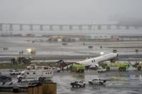 Officials investigate the site, Monday, March 23, 2026, where an Air Canada jet came to rest after colliding with a Port Authority firetruck at LaGuardia Airport, shortly after landing Sunday night in New York. (AP Photo/Seth Wenig)