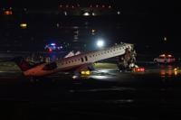 An Air Canada jet and Port Authority fire truck sit on the runway at LaGuardia Airport, Monday, March 23, 2026, after colliding with each other after the Jet landed Sunday night in New York. (AP Photo/Seth Wenig)