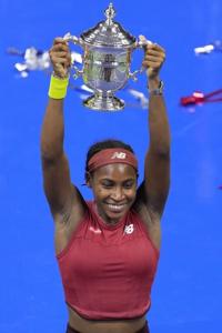 Coco Gauff, of the United States, poses for photograph after defeating Aryna Sabalenka, of Belarus, during the women's singles final of the U.S. Open tennis championships, Saturday, Sept. 9, 2023, in New York. (AP Photo/John Minchillo)