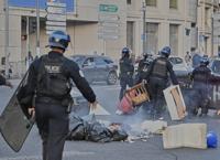 French police walk through burning waste as they try to disperse protesters during a gathering of the "Block Everything" movement in Marseille, south of France, Wednesday, Sept. 10, 2025. (AP Photo/Philippe Magoni)