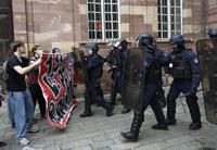 Protesters of the "Block Everything" movement face French police as they hold a banner that reads, "one hero, the people, blocking everything" in Strasbourg, eastern France, Wednesday, Sept. 10, 2025. (AP Photo/Pascal Bastien)