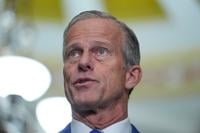 Sen. Majority Leader John Thune, R-S.D., speaks during a news conference after a policy luncheon on Capitol Hill, Tuesday, March 24, 2026, in Washington. (AP Photo/Mariam Zuhaib)