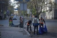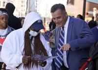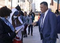 Democrat Thomas McDermott, right, a candidate for U.S. Senate, talks with voters outside of the City-County Building, Monday, Nov. 7, 2022, in Indianapolis. (AP Photo/Darron Cummings)