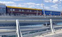 In this image from a video released on Wednesday, July 19, 2023 by the Russian National Antiterrorism Committee, A passenger train passes by the damaged parts of an automobile link of the Crimean Bridge connecting Russian mainland and Crimean peninsula over the Kerch Strait not far from Kerch, Crimea. (Russian National Antiterrorism Committee via AP)