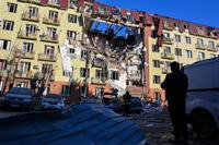 A local man stands in front of residential building which was heavily damaged after a Russian strike in Odesa, Ukraine, Monday, April 6, 2026. (AP Photo/Michael Shtekel)