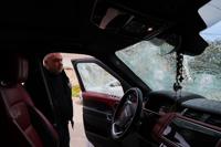 A man and a woman drive a vehicle with a shattered windshield in the predominantly Christian town of Al-Suqaylabiyah, west of Hama, Syria, Saturday, March 28, 2026, following overnight violence. (AP Photo/Omar Albam)