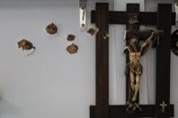 Bullet holes mark a wall next to a crucifix following overnight violence in the predominantly Christian town of Al-Suqaylabiyah, west of Hama, Syria, Saturday, March 28, 2026. (AP Photo/Omar Albam)