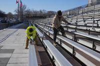 FILE - mWorkers continue construction on bleachers at Freedom Plaza along Pennsylvania Avenue for parade seating ahead of the upcoming inauguration of President-elect Donald Trump in Washington, Jan. 14, 2025. (AP Photo/Jon Elswick, File)