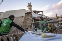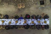 A table is prepared for iftar, the fast-breaking meal, organized by the Turkish Humanitarian Relief Foundation (IHH), on the first day of Ramadan in the Jobar neighborhood, which was devastated by the Syrian war, in Damascus, Syria, on Saturday, March 1, 2025.(AP Photo/Ghaith Alsayed)