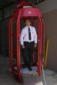 Mannas Fourie, CEO of Mines Rescue Services, inspects the mobile rescue winder that was used to rescue miners, during an interview in Carletonville, South Africa, Tuesday, Jan. 21, 2025. (AP Photo/Themba Hadebe)