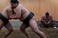 Sumo wrestlers train during a morning practice at Ajigawa stable in Tokyo, Wednesday, Feb. 4, 2026. (AP Photo/Louise Delmotte)