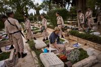 Israeli soldiers and relatives visit a military cemetery ahead of the annual Memorial Day honoring fallen soldiers and victims of nationalistic attacks in Tel Aviv, Israel, Monday, April 20, 2026. (AP Photo/Oded Balilty)