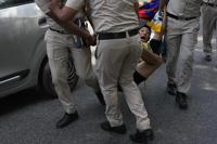 An Indian policeman detains an exile Tibetan protesting against the human rights situation in Tibet during a protest to coincide China marking its 75th year of Communist Party rule, outside Chinese embassy, in New Delhi, India, Tuesday, Oct. 1, 2024. (AP Photo/Manish Swarup)
