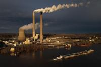 A barge on the Ohio River moves past the Mountaineer Power Plant, a coal-fired power plant near New Haven, W.Va., early Friday, March 13, 2026. (AP Photo/Carolyn Kaster)