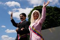Performers on stilts dressed as former Venezuelan President Nicolas Maduro and his wife Cilia Flores wave during a march by government supporters calling for their release after U.S. forces captured them, in Caracas, Venezuela, Friday, Jan. 9, 2026. (AP Photo/Ariana Cubillos)